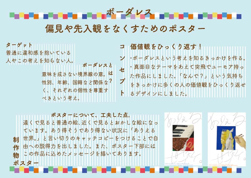 先入観をなくすことをポップに表現しました。タイトルとイラストのギャップで価値観をひっくり返すデザインにしました。