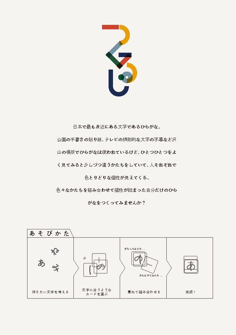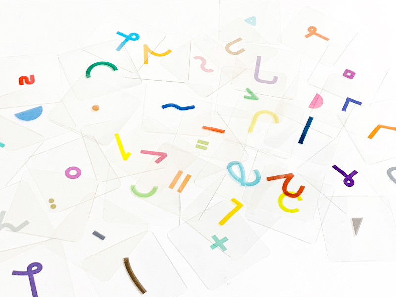 ただカードを重ねるだけではなく、わざとかたむけてみたり、ずらしてみたり、ひっくり返してみたりと工夫しだいで色々なかたちの自分だけの文字をつくれるツールになっています。