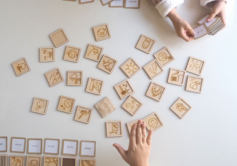 オノマトペを使った絵合わせやかるたとして遊べる知育玩具。オノマトペを使うことで表現の幅が広がり、より細かい感覚や感情を伝えることができます。オリジナルで作ることできる札も用意しました。